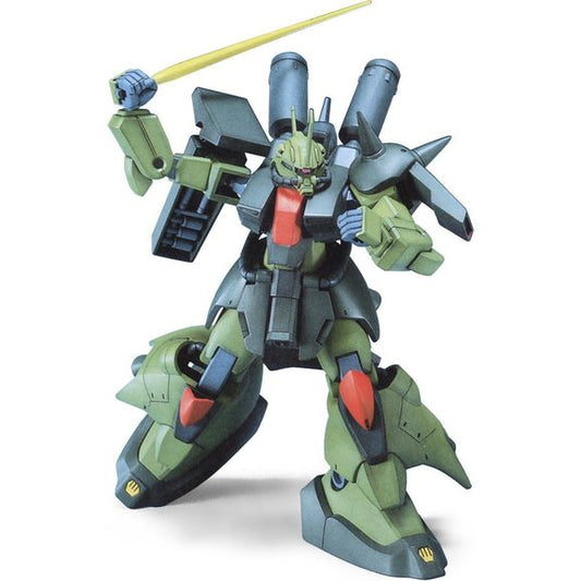 A Neo-Zeon use mobile suit from ZZ Gundam customized for Mashymyre Cello in traditional Zaku green coloring. Includes beam rifle, beam saber, and skirt mounted beam cannons.
